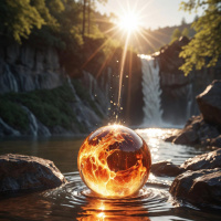 small sparkles or droplets around it, creating a visually captivating effect. The water's surface is disturbed by these sparkles, suggesting movement. In the background, there is a clear stream flowing through what seems to be