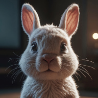 The image features a charming bunny with a soft, fluffy coat of fur. Its big, expressive eyes gaze directly at the viewer, giving it an almost human-like quality. The background is dark and moody, which contrasts with the bunny's innocent expression.