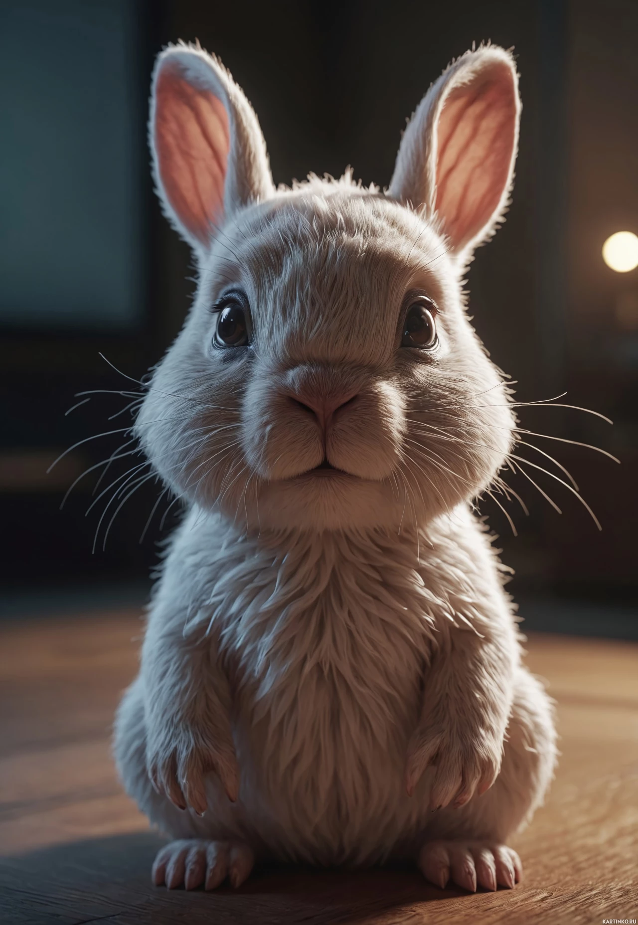 На картинке изображён очаровательный зайчик с мягкой, пушистой шерстью. Его большие, выразительные глаза смотрят прямо на зрителя, придавая ему почти человеческий вид. Фон тёмный и мрачный, что контрастирует с невинным выражением мордочки зайчика.