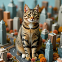 an attentive expression. The cityscape around the cat includes buildings that resemble those found in major