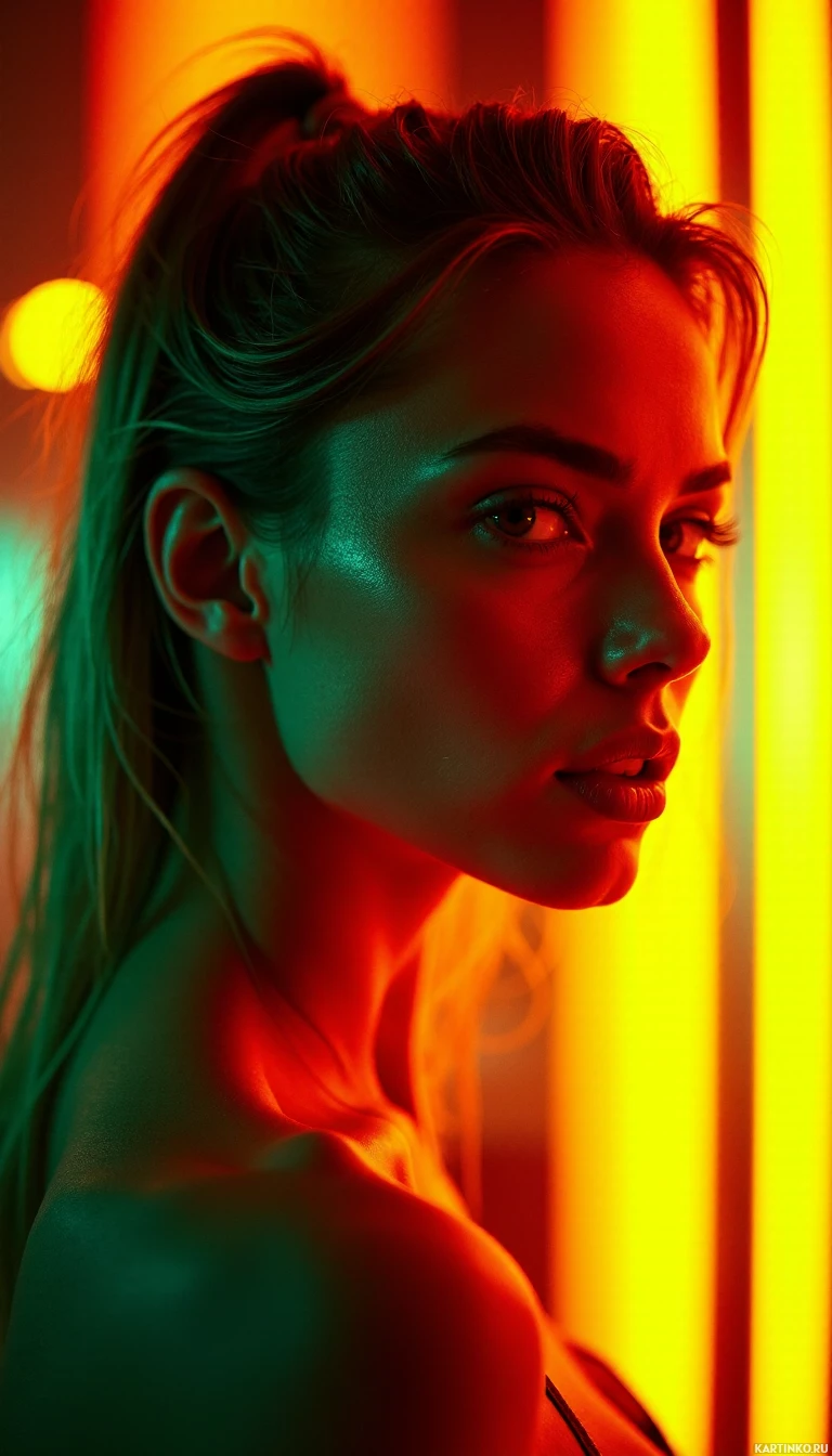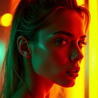 skin tones and the vibrant backdrop. There are colorful lights behind her that suggest a neon ambiance, which might indicate the setting is a nightclub or a similarly