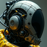 advanced technology that requires it. The helmet is connected to what appears to be headphones or communication devices, indicating a theme of technological enhancement or communication within