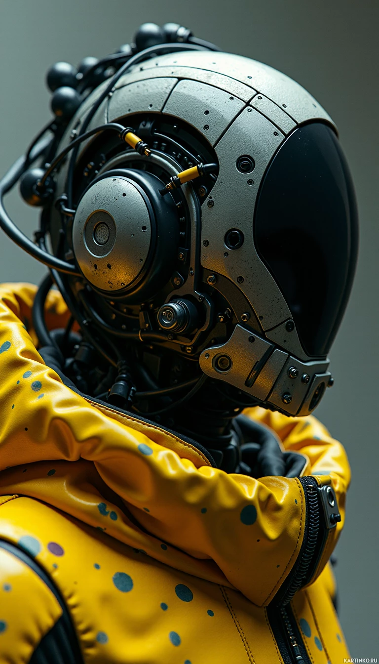 the science fiction context. The figure also wears a yellow, quilted garment with pockets and straps that give it an industrial or space-ready appearance. This attire could be interpreted as a functional outfit for