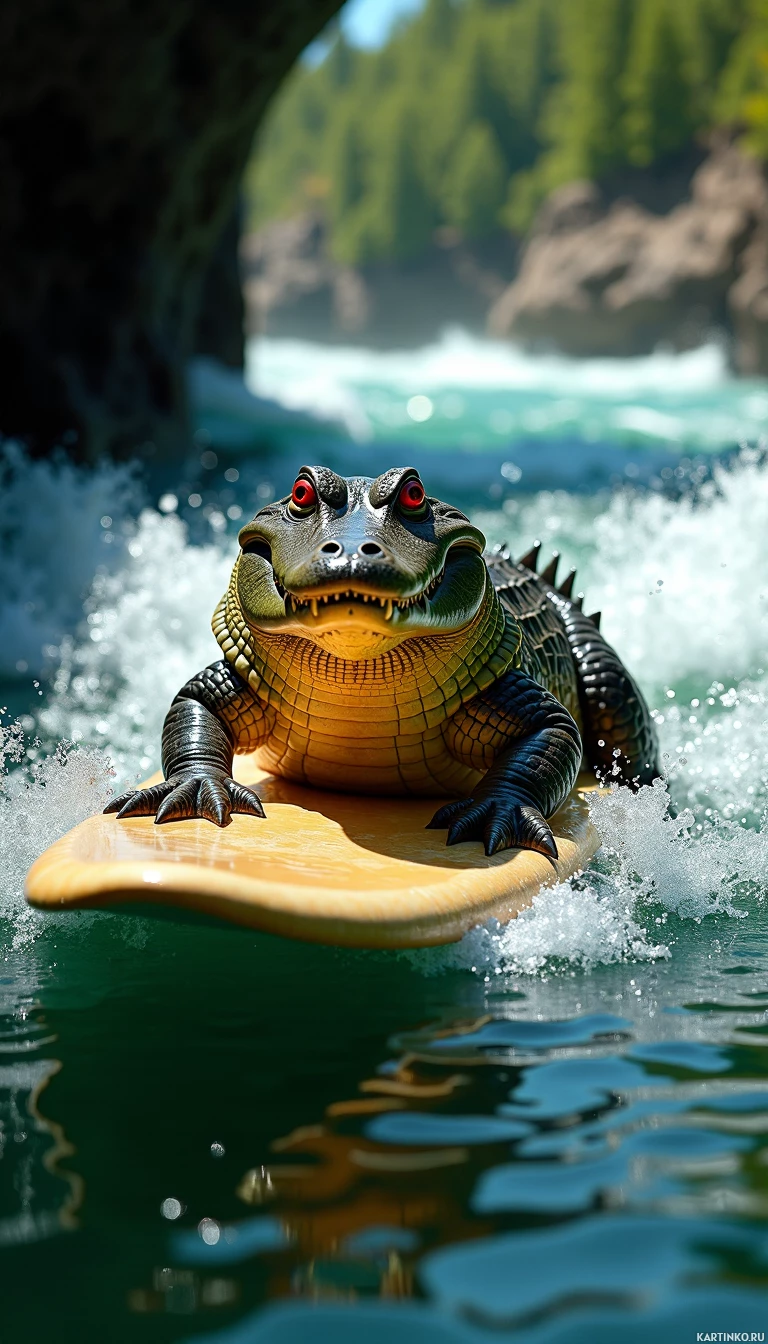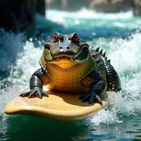 digital art, giving it a whimsical appearance. It's holding its arms out as if balancing itself on the surfboard, which adds to the humorous
