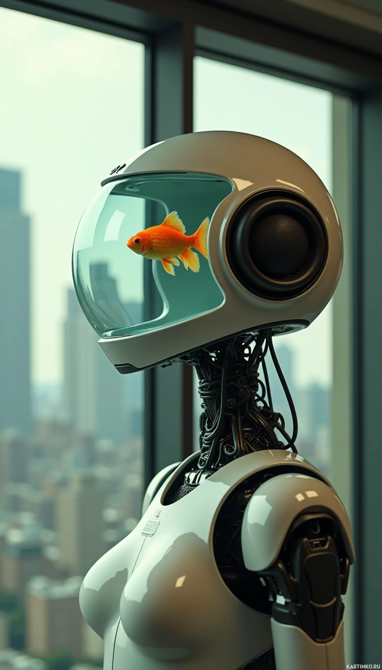 a humanoid form with a head, torso, and limbs, and is adorned with various technological components, such as sensors or interfaces on the forehead, shoulders, and chest area. The robot's head is designed to mimic human features, including eyes that are not visible from this angle. The most striking feature of the robot is a fishbowl helmet or headgear that has a single goldfish inside it. This gives the robot a unique and surreal appearance, as it juxtaposes