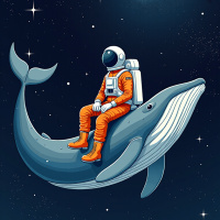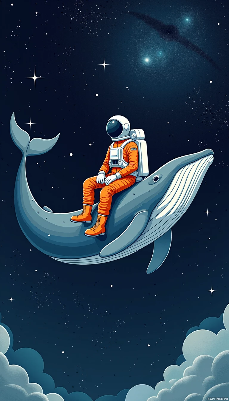space gear including a helmet, sits on the back of a blue whale. The whale floats through a starry