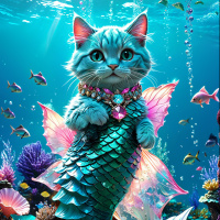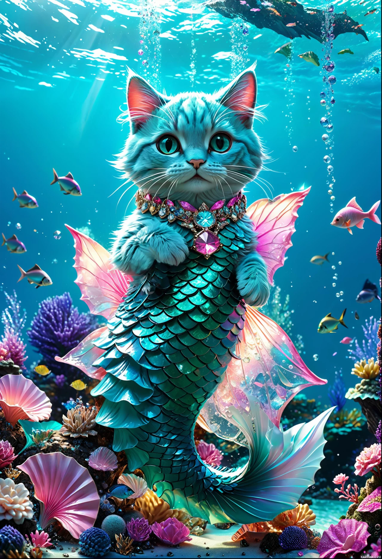 The image features a whimsical artwork of a cat with fish-like characteristics. The cat, which is the central figure in the image, has a tail resembling that of a fish and scales like a mermaid's, with