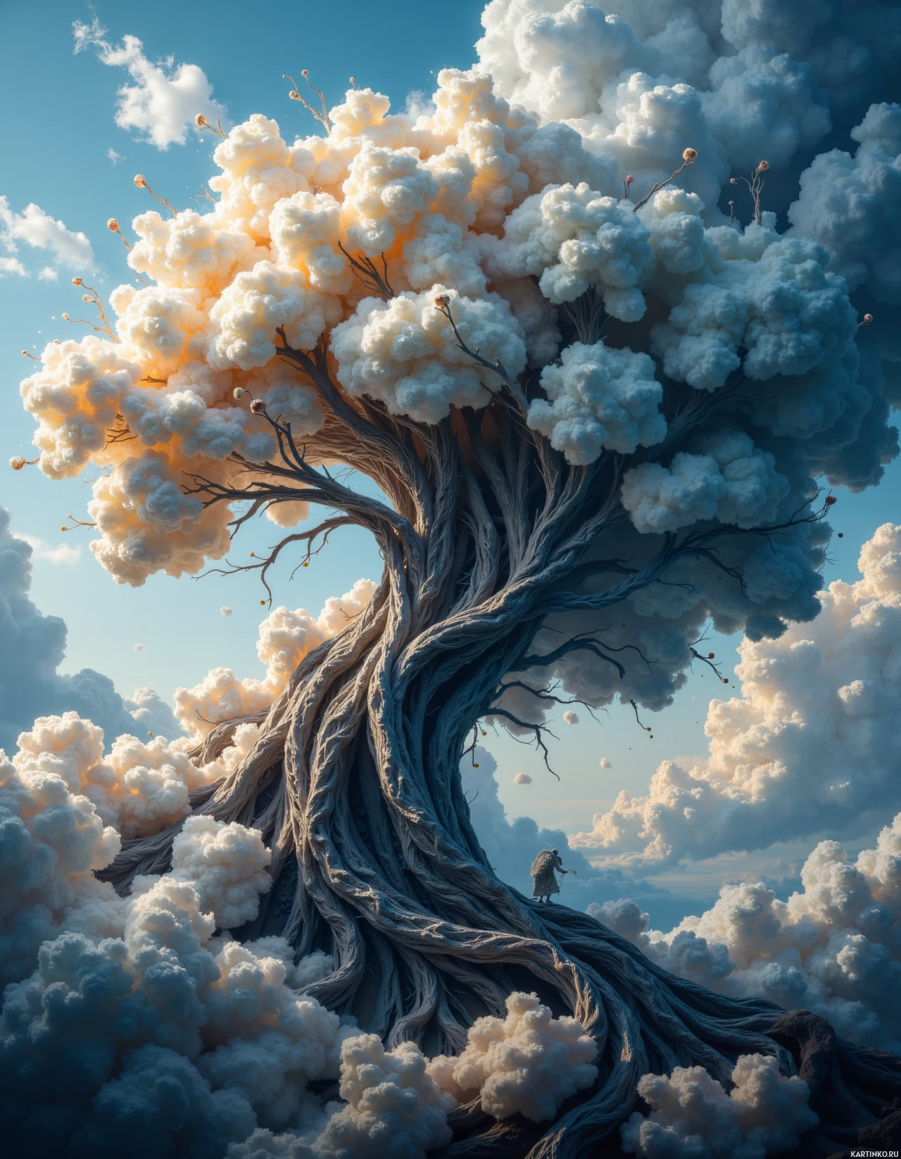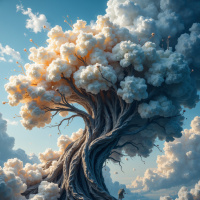 a fantastical scene featuring a large, tree-like cloud formation. At the top of this cloudy tree is