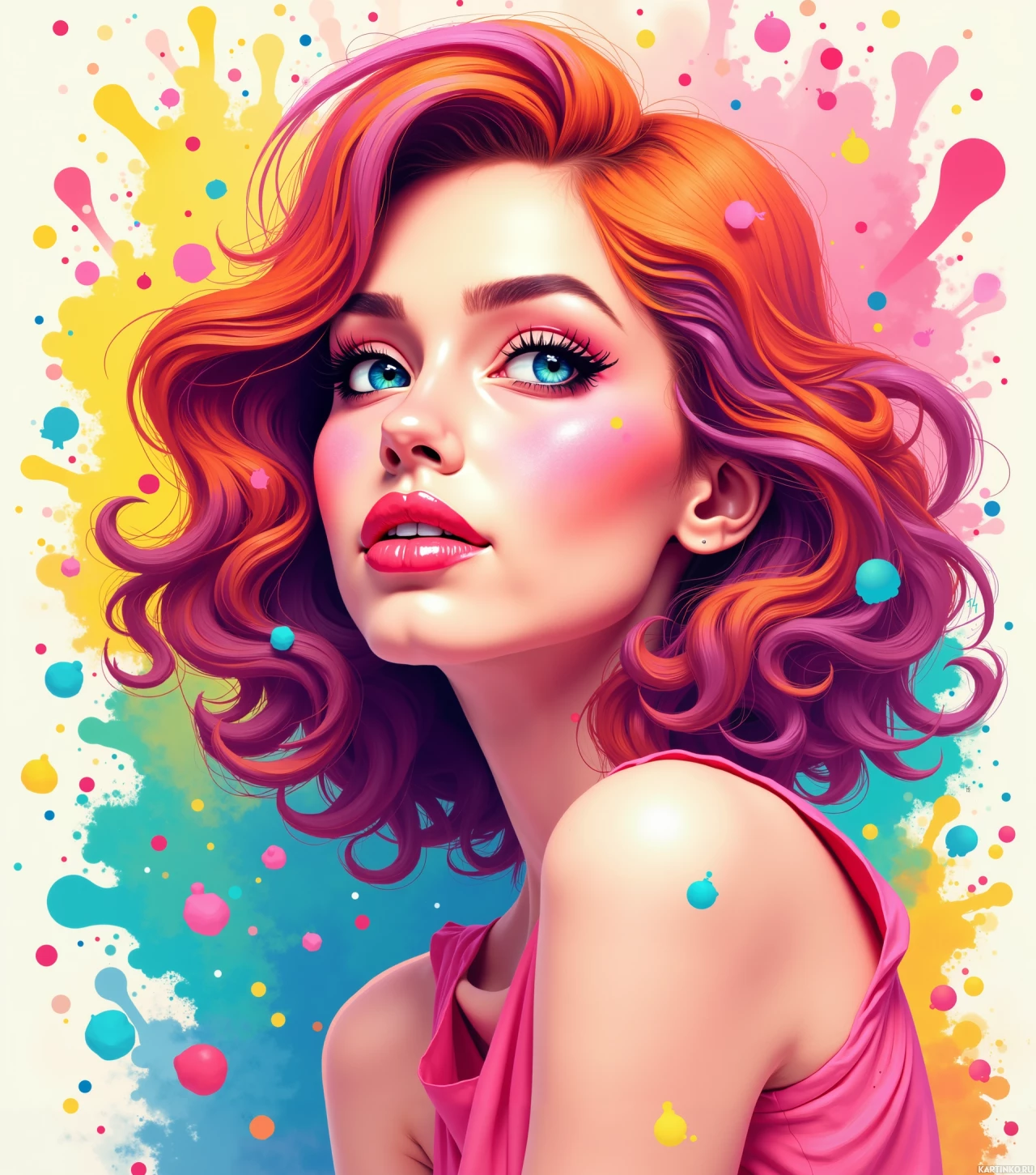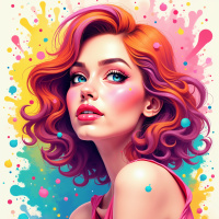 colorful splashes and drips, resembling what might be paint or some other type of vivid media being poured over a canvas. These splashes create a dynamic and lively atmosphere around her. The overall style of the image is illustrative with bold colors and dramatic lighting that highlights the woman's features against the colorful backdrop.