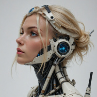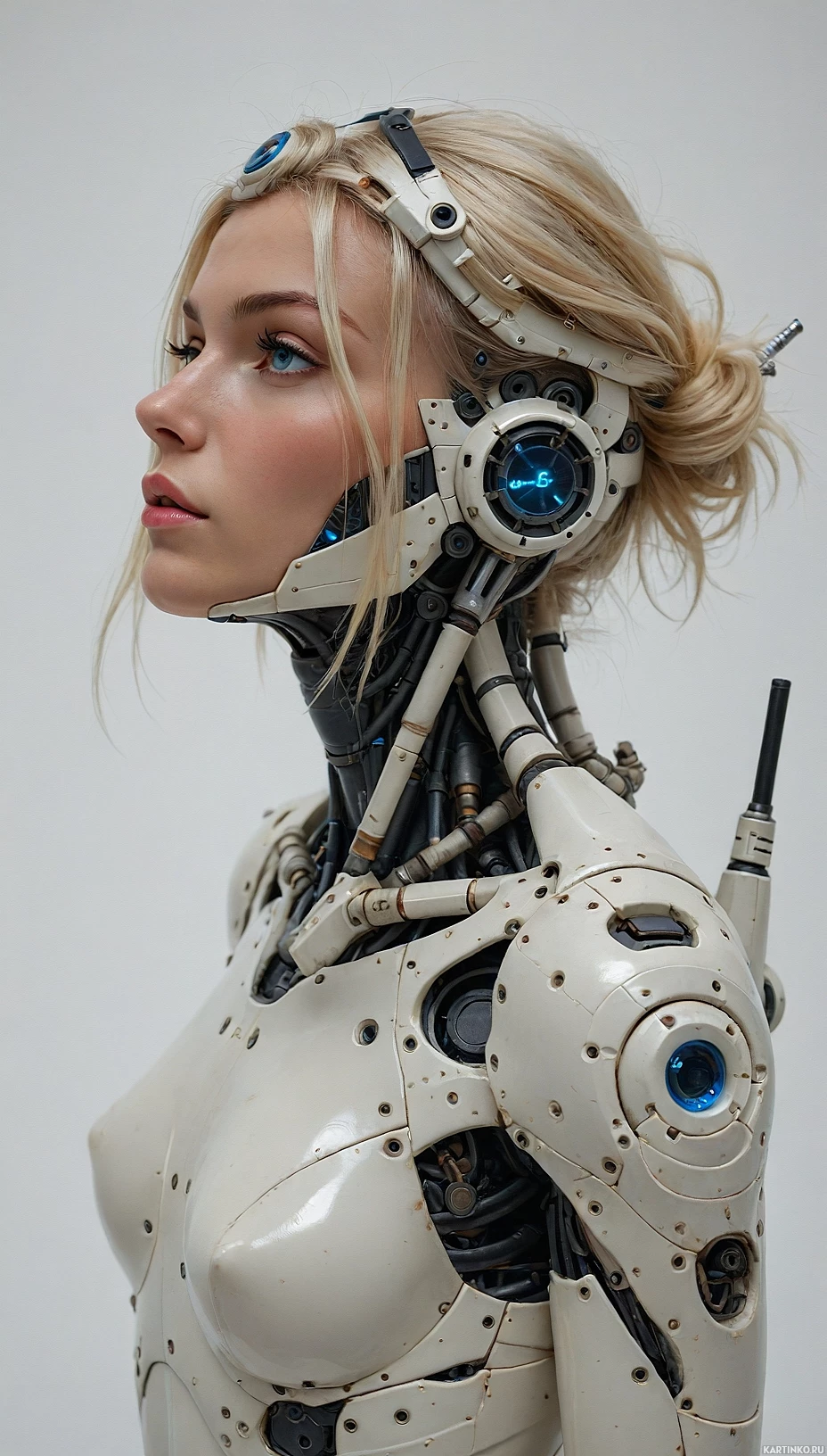 a robotic exoskeleton or endoskeleton on her neck and shoulders. This mechanical structure appears to be made of metal components with blue details, which suggests it could be part of