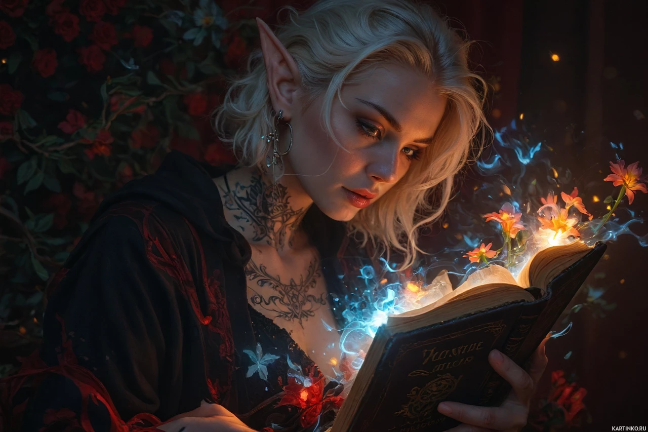 a mystical setting with red flowers and a warm, glowing light that could indicate a fireplace or a spell being cast. The book the person is reading has text on its pages which are not legible in the image. The overall atmosphere of the picture is one of enchantment and mystery, with an emphasis on the themes of fantasy and magic.