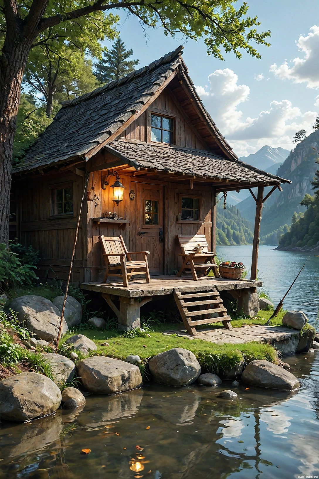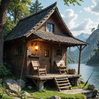 На картинке изображена живописная горная хижина, спрятанная в пышном зелёном пейзаже. Хижина выполнена в деревенском стиле – деревянные стены и черепица, на фоне далёких гор под переменной облачностью. Перед хижиной небольшой сад с аккуратно подстриженными кустарниками, рядом видны несколько крупных камней. Вода перед хижиной отражает чистое голубое небо. Слева от входа стоит скамейка, а к двери ведут ступеньки. В целом, сцена очень спокойная и идиллическая.