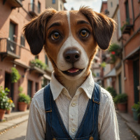 potted plants, and other urban elements in the background. The dog appears to be dressed up as a human would dress, including