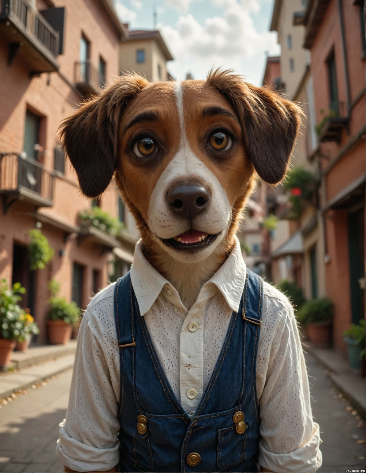 an anthropomorphic dog wearing clothes. It is sitting on a street with buildings,