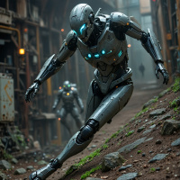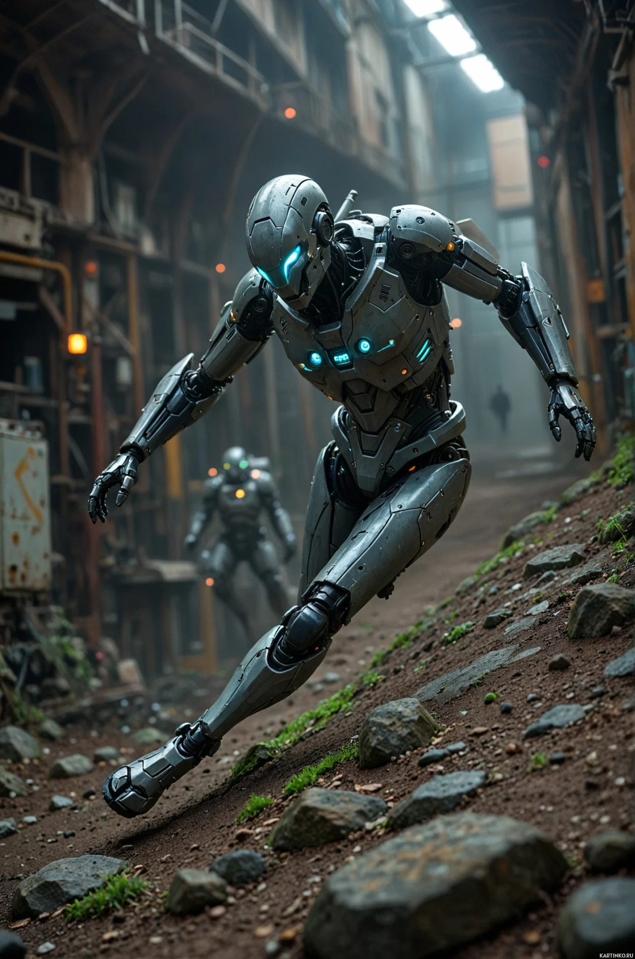 the industrial environment and the robot's aesthetic. The overall scene suggests themes of