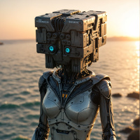 the soft lighting and golden sky. The robot has a head with a complex mechanical structure resembling circuitry and digital readouts, indicative of advanced technology often seen in
