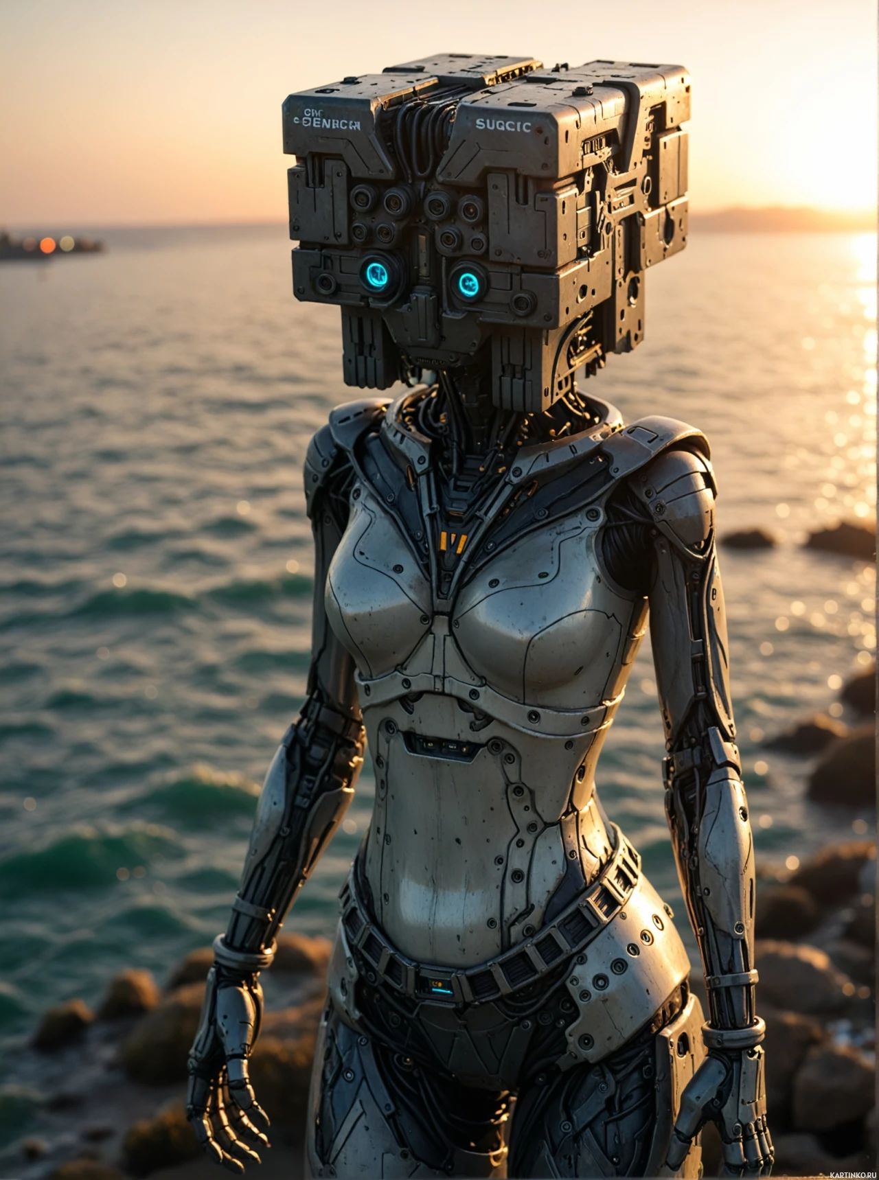 The image features a humanoid robot standing by the ocean at what appears to be either dawn or dusk, given