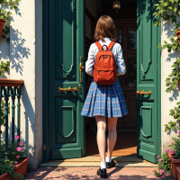 In the image, there is a person from behind, wearing a backpack and skirt. They appear to be walking towards