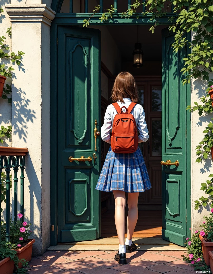 an open door with their hand on it, possibly entering or leaving a building. The scene is set outdoors with