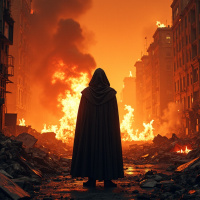 a single figure standing amidst the ruins of a city that has been consumed by fire. This person is dressed in