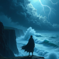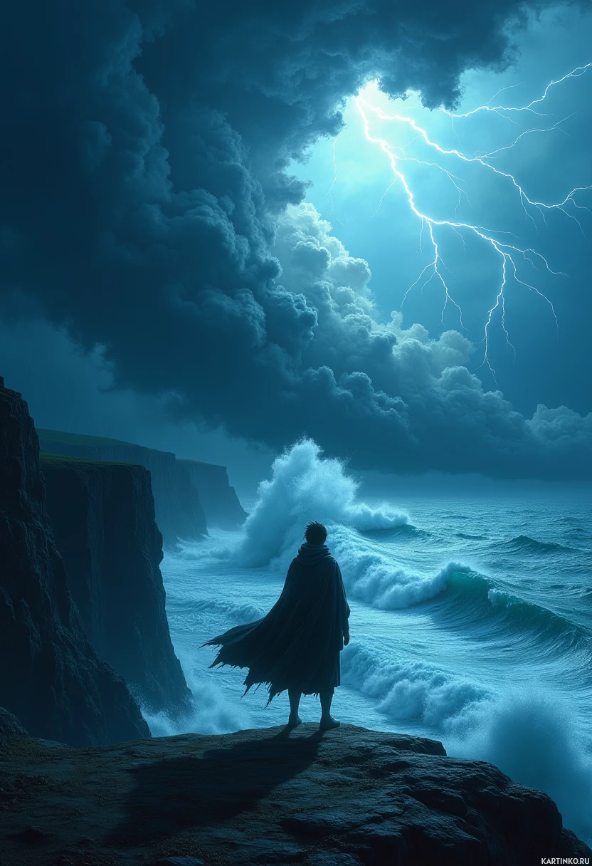 the tumultuous sea that is churning with large waves. Their clothing is a cloak, suggesting they might be wearing some sort of protective or ceremonial garment appropriate for the weather and environment depicted.