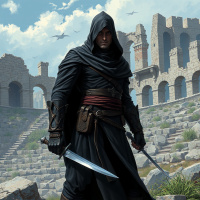 a black hood and cloak, a leather armor outfit with visible metal belt buckle, gloves, and boots, as well as what looks like a utility belt with pouches. The character is holding a sword with both hands, ready for combat or display. There are no people other than the central figure in this image. The background shows an ancient-looking cityscape with