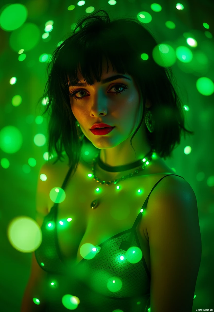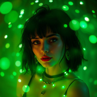 light particles or effects that create an illusion of glowing specks. She has short