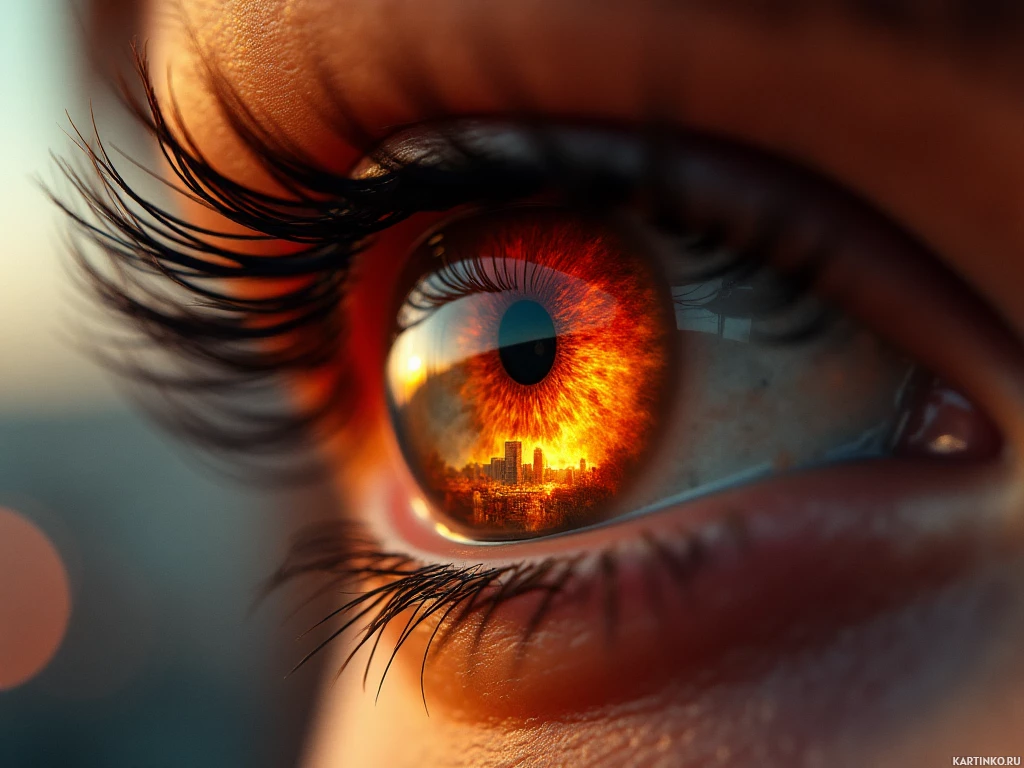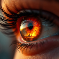 an orange tint, indicating the presence of melanin. The iris is captured in such a way that it appears to be looking out towards a sunset or sunrise over
