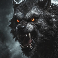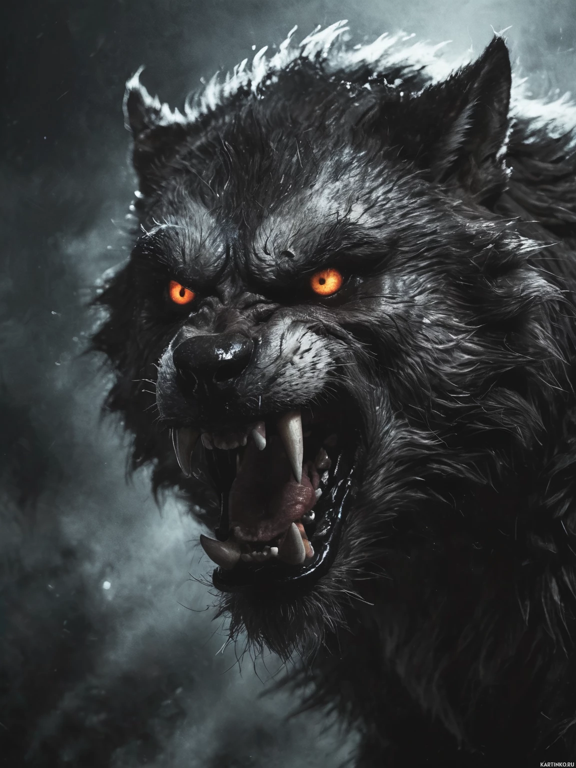 sharp teeth and claws visible, with its eyes glowing red and yellow, suggesting a supernatural or menacing presence. Its fur is rendered in a realistic style, with shades that mimic