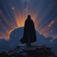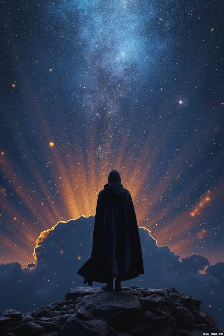 На картинке запечатлён человек, стоящий на одиноком скальном выступе, словно на рассвете или закате, судя по золотистому сиянию, исходящему позади него. Он стоит спиной к зрителю, глядя на усыпанное звёздами небо, где вдали виднеется знаменитая туманность – Млечный Путь. На его плечах – накинутый плащ с капюшоном, а он находится в центре художественной композиции, включающей драматичные облака, лучи света, исходящие снизу, и парящие обломки – возможно, метеориты – возле земли. Общее впечатление – захватывающий дух пейзаж, возможно, символизирующий внутреннее размышление на фоне космической бездны.