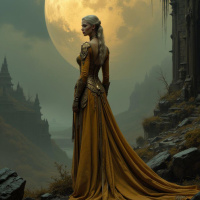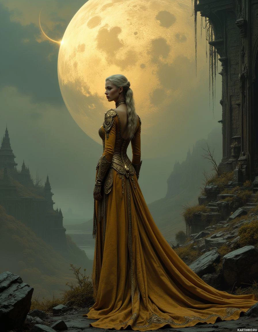 moon in the sky above her, contributing to the serene yet dramatic atmosphere of the image.