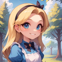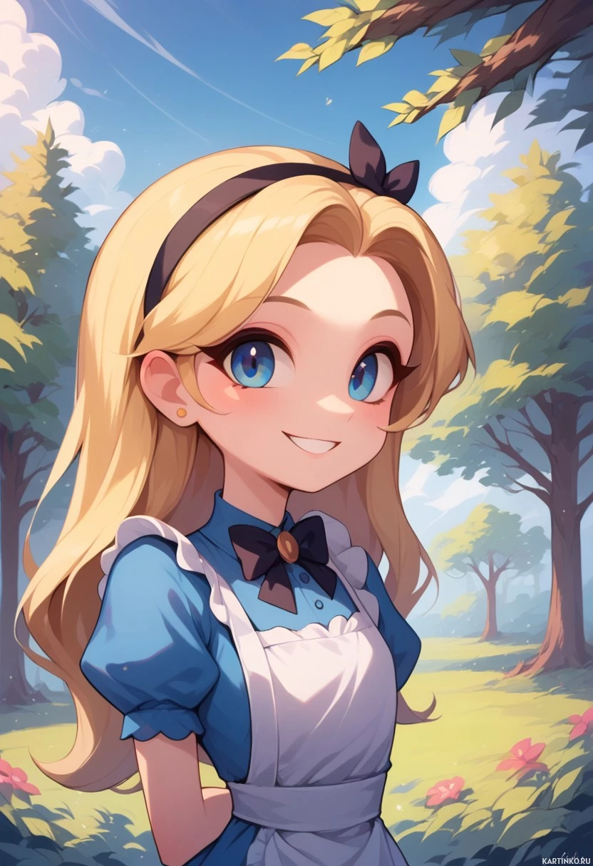 rosy cheeks and is smiling at the viewer, giving off a friendly and welcoming vibe. She is wearing what seems to be a classic Alice in Wonderland-style dress with