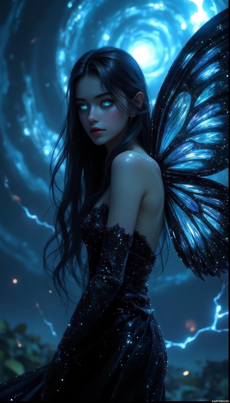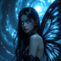 black dress that appears to be made of star-studded fabric, giving it a constellation-like appearance. Overlapping her wings, which are of a dark