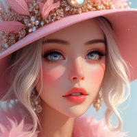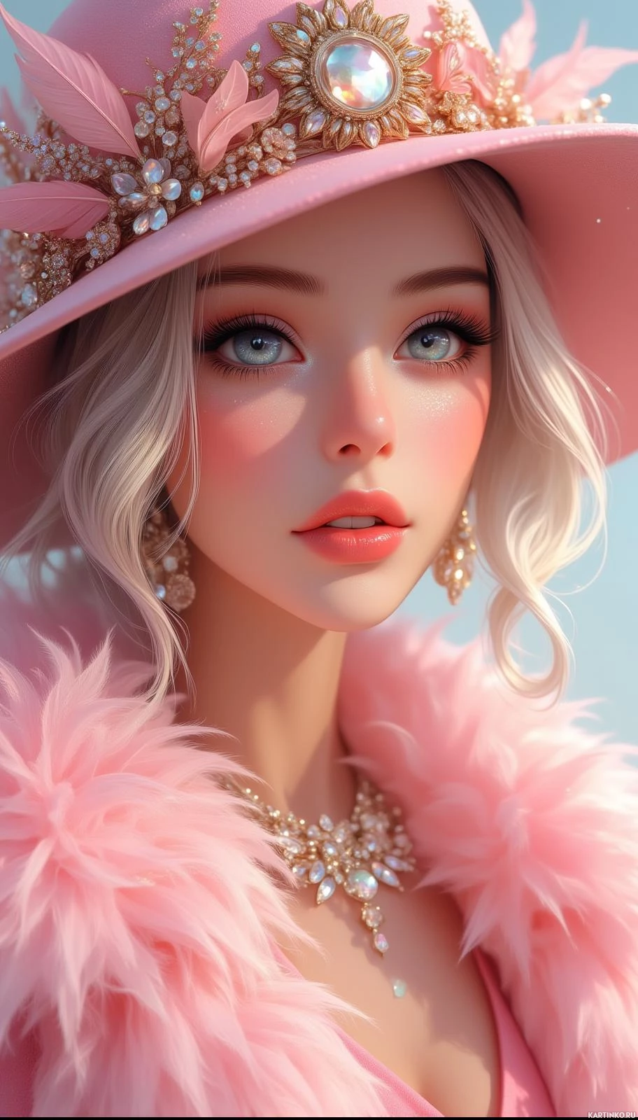 fashionable attire: they are wearing a pink feathered coat over a pink fur stole and have a matching pink hat with an ornate design, possibly featuring a large bow on the front. The background of the image is neutral, providing no additional context or information about the setting.
