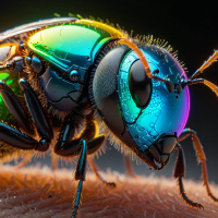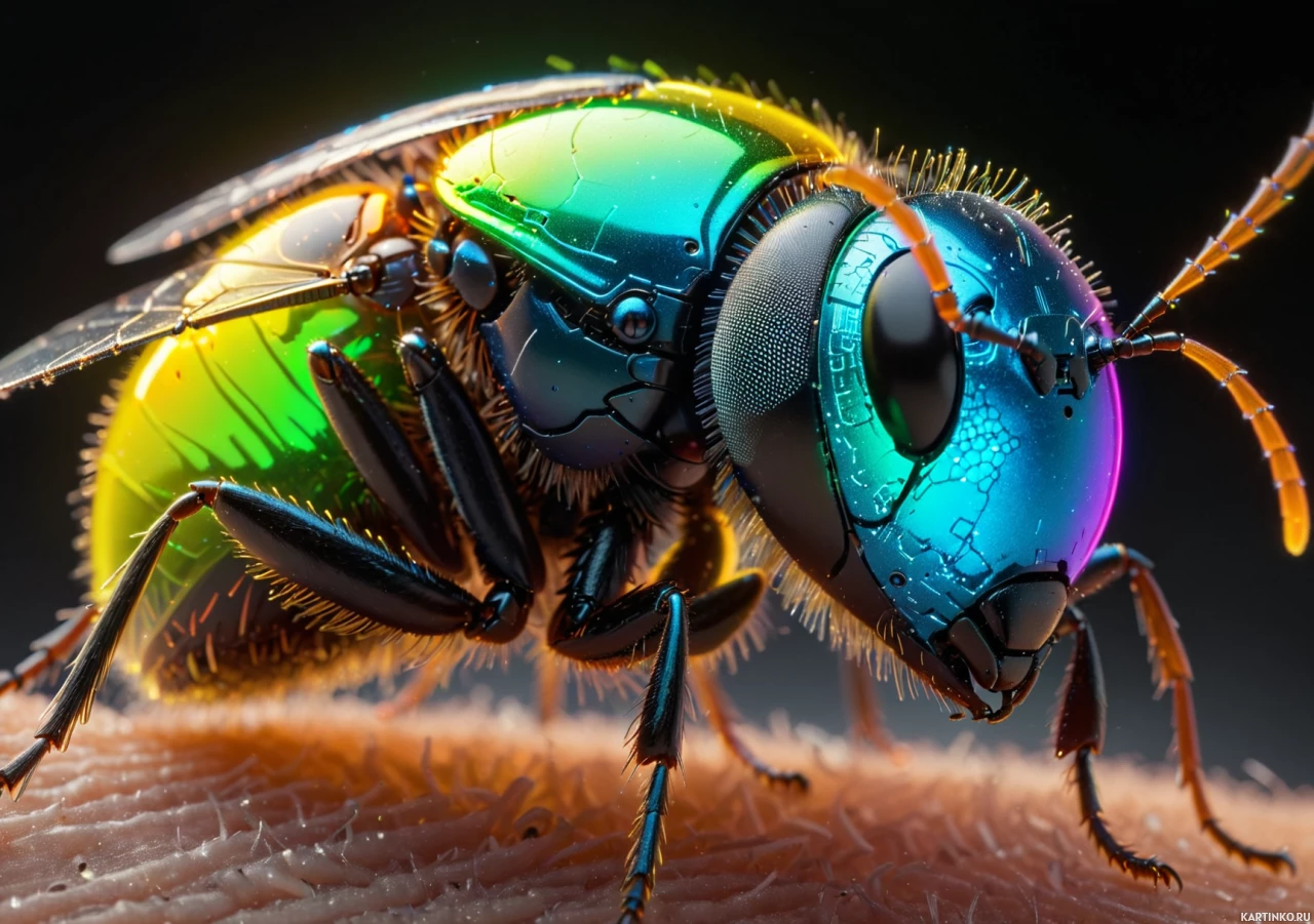 The image features a bee with a metallic and colorful appearance, sitting on someone's hand. The bee has iridescent wings that seem to reflect light in various