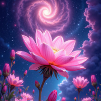 На картинке — яркое ночное небо с галактикой на заднем плане и крупной звездой в центре. Под звездной высью расцветает лотос во всей красе. У этого центрального цветка восемь лепестков разных оттенков розового и фиолетового, а стебель кажется зеленым, с небольшими листьями, расходящимися в стороны. Вокруг этого цветка множество маленьких лотосов в тех же тонах, все они будто освещены теплым светом. Общая атмосфера — умиротворенная и сказочная, словно запечатлен момент безмятежности под ночным небом.