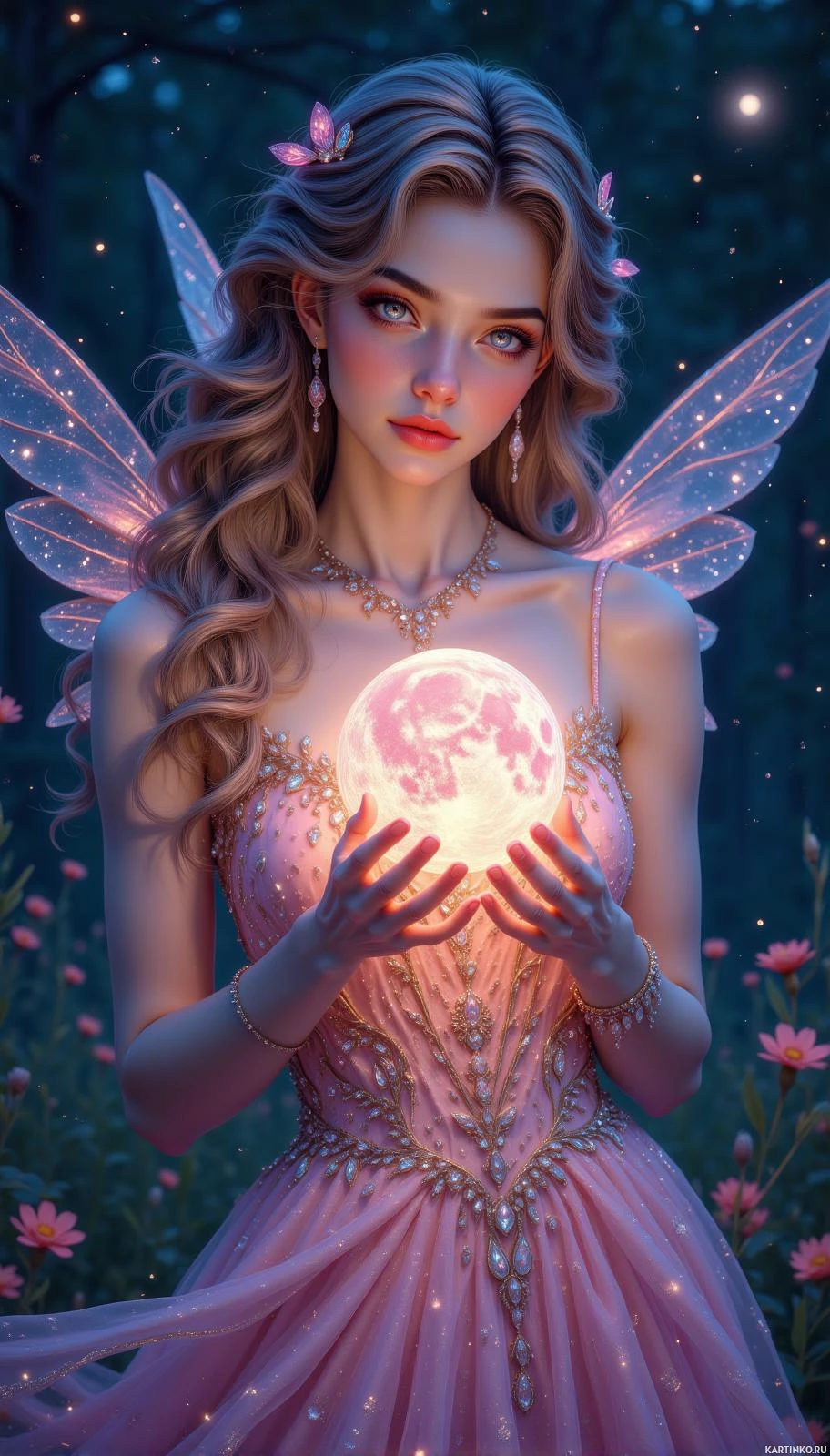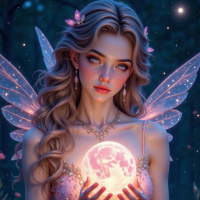 large eyes and pointed ears indicative of a fantasy or mythical being. The fairy is holding a luminous moon in one hand, which suggests she might have magical properties related to light or