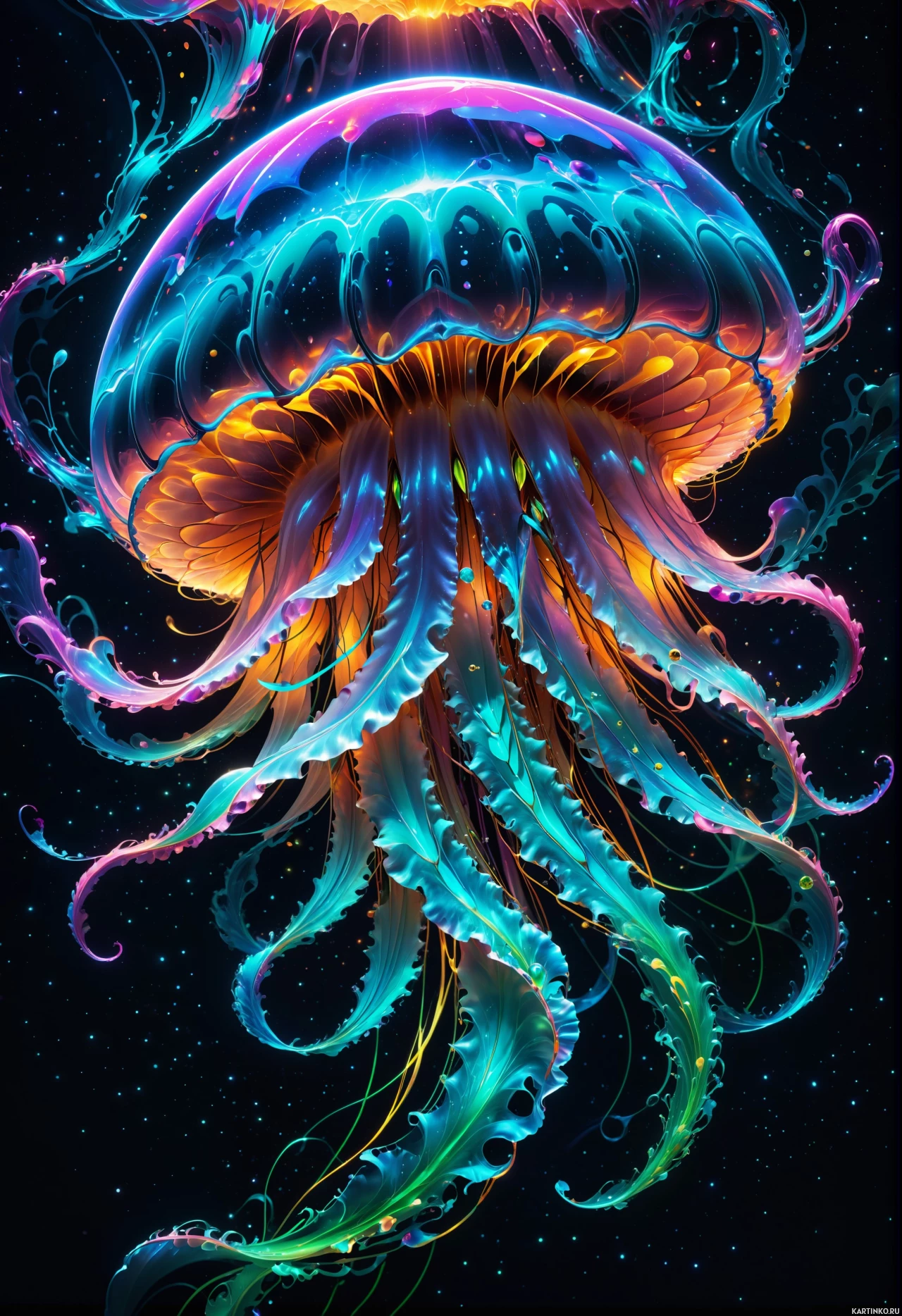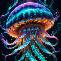 The image features a vibrant and colorful depiction of a jellyfish. It is illustrated with an array of colors, showcasing its bell-like body that's typically purple or blue and trailing tentacles in shades of pink, orange, yellow, and green. This image may be digitally created or enhanced for