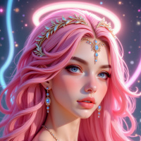 pink hair styled in loose waves and is wearing makeup that accentuates her eyes and lips, giving her an ethereal appearance. Her skin appears to be pale, contrasting with