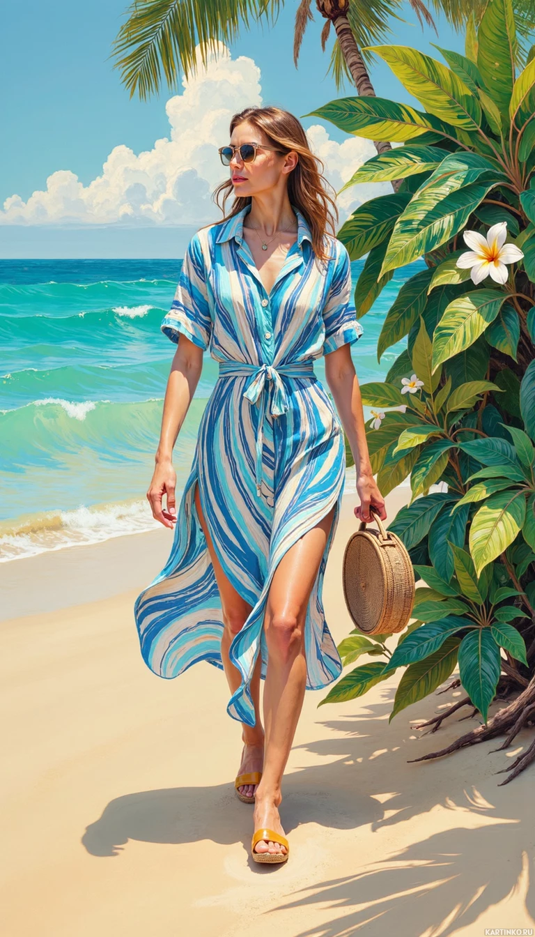 flowing dress with a tied waist, and she carries an open-front tote bag that matches her outfit. Her hair is styled down with sunglasses perched on top. The setting suggests a tropical location with clear blue skies and calm