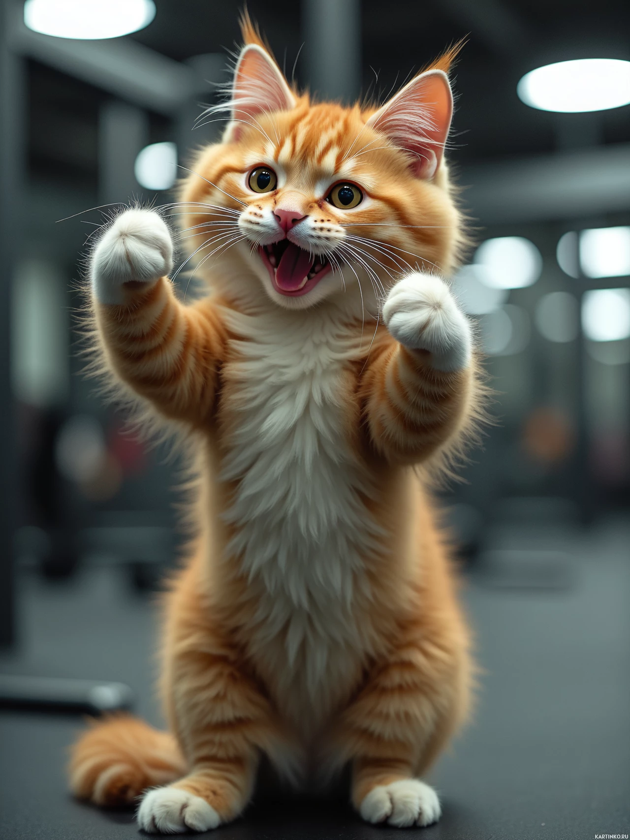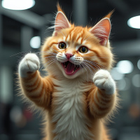 front paws extended outward with claws fully visible and a somewhat surprised or playful expression. There's a strong emphasis on the cat's facial features due to the shallow