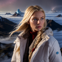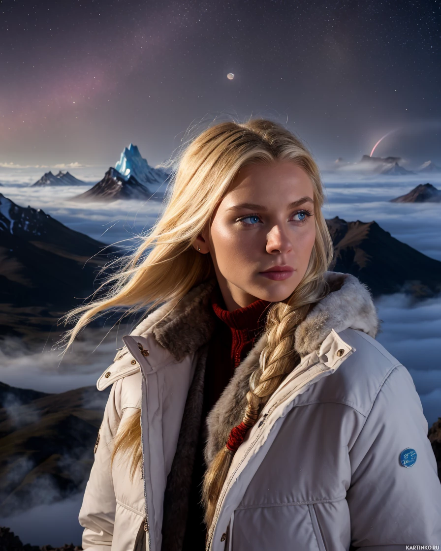 a neutral expression on her face. Her gaze is directed slightly away from the camera, suggesting she might be looking at something or someone not visible within the frame. The background features an otherworldly landscape with snow-capped mountains and