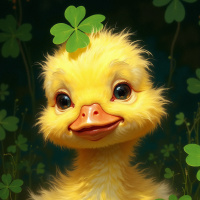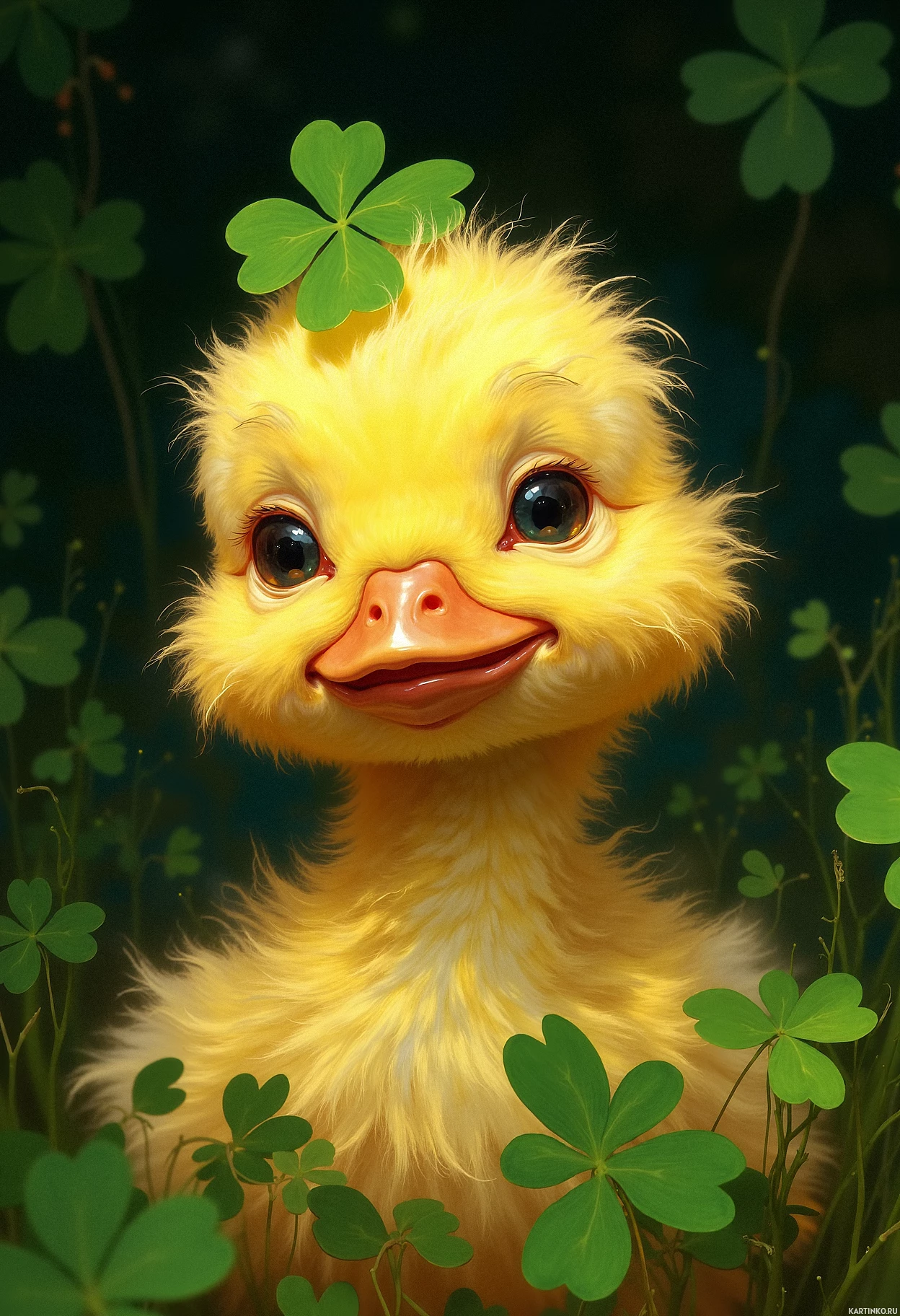 long eyelashes, giving it a somewhat anthropomorphic expression. The background consists of what appears to be grass with green blades and four-leaf clover sprouts sprouting from the ground around the duckling's feet.