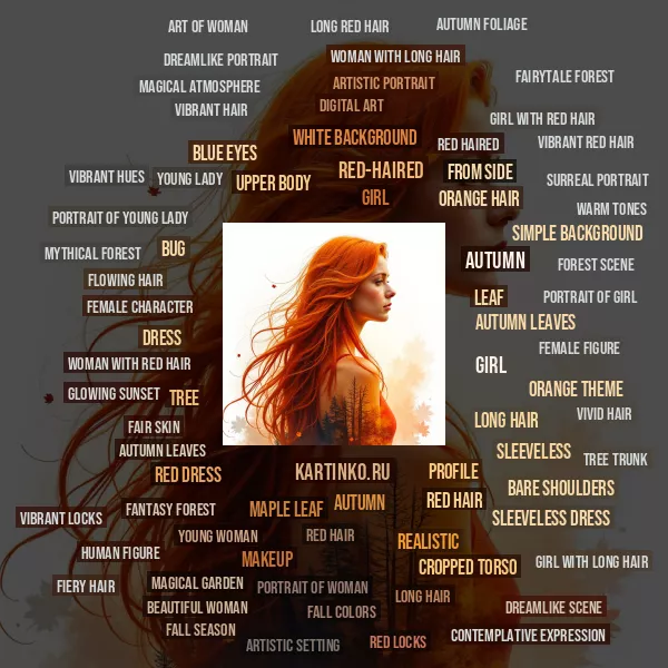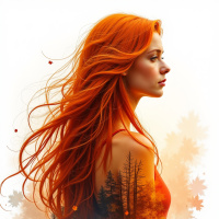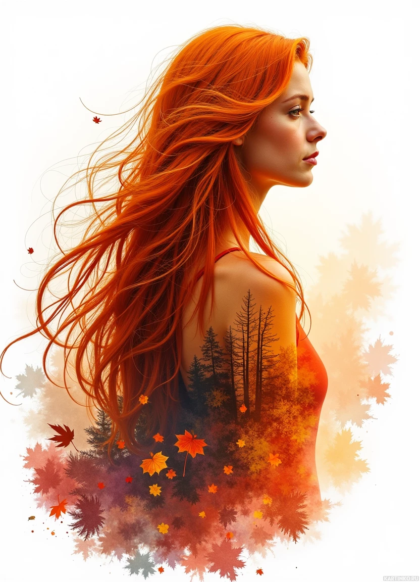 fair skin and her long locks cascade over her shoulders. Her gaze is directed off to the side, giving the impression that she is looking beyond what is in front of her. Surrounding her is an autumnal flurry, suggesting a change of seasons with leaves and perhaps