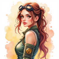 pieces of equipment on her shoulders, possibly representing wings or rank insignias. The background has