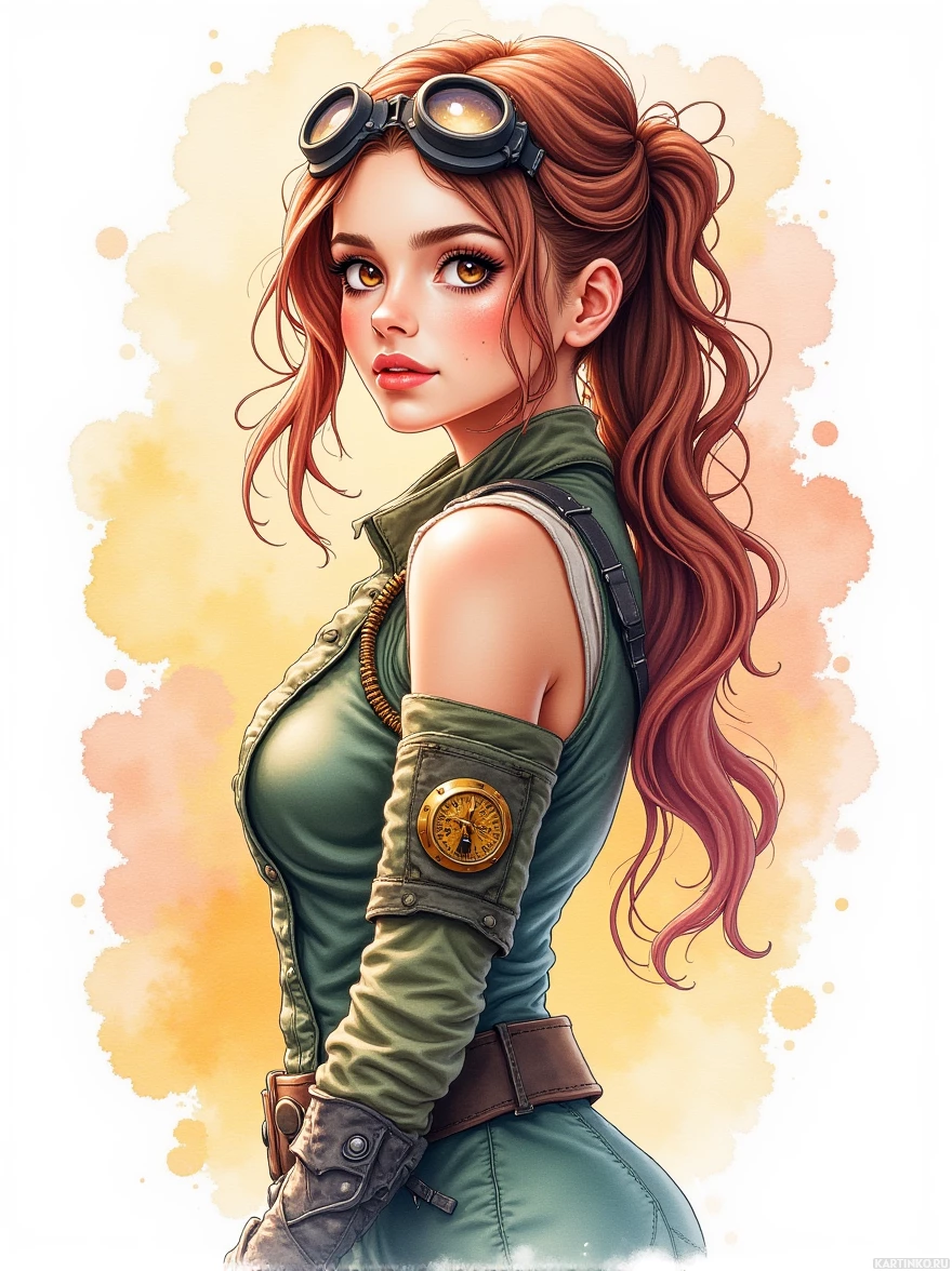 red hair. She is wearing what appears to be a pilot's gear, including a helmet and a jacket that suggests a military or aviator theme. There are also some visible