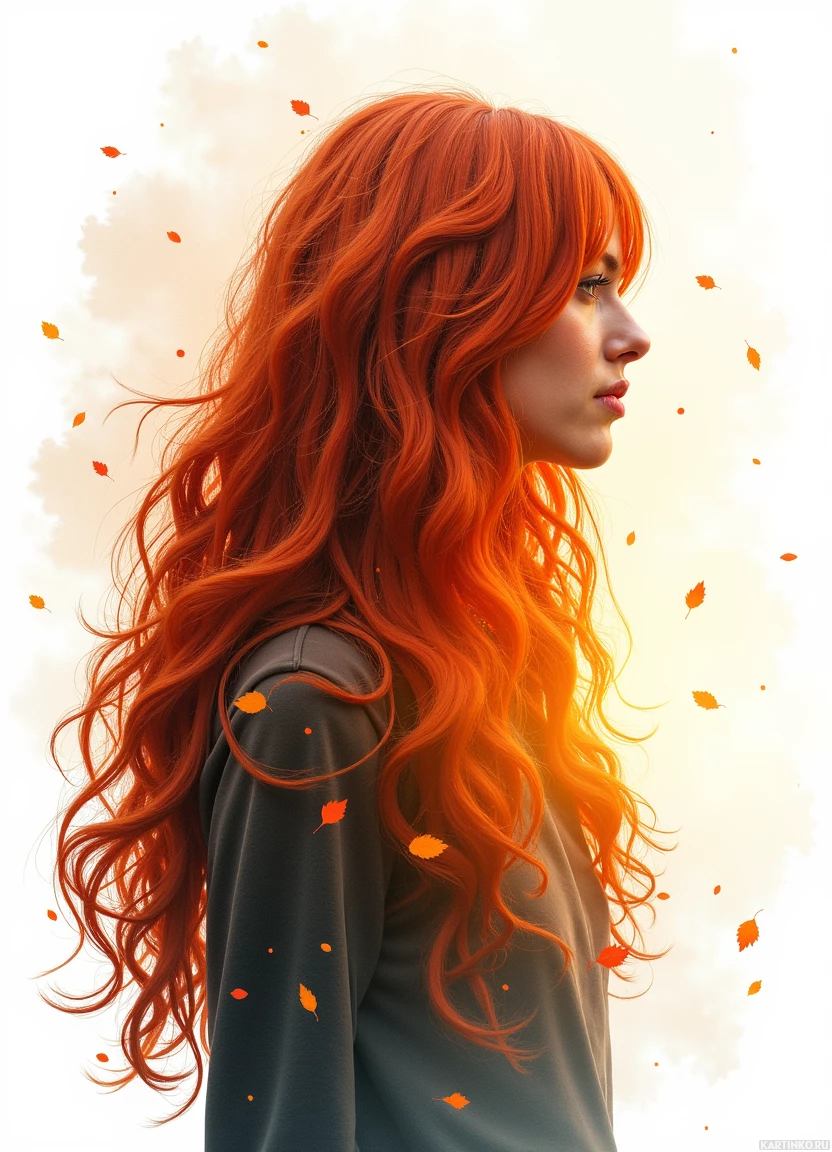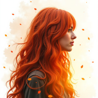 a young woman with striking red hair that cascades down her shoulders. Her gaze is directed slightly away from the viewer, giving her an introspective appearance. She has