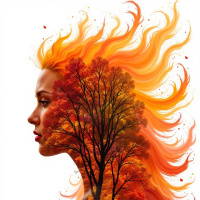 shades of orange and yellow, giving the impression that the woman's hair is ablaze or transforming into flames. The image has been edited to include these elements artistically and creatively, possibly for a thematic purpose or as part of