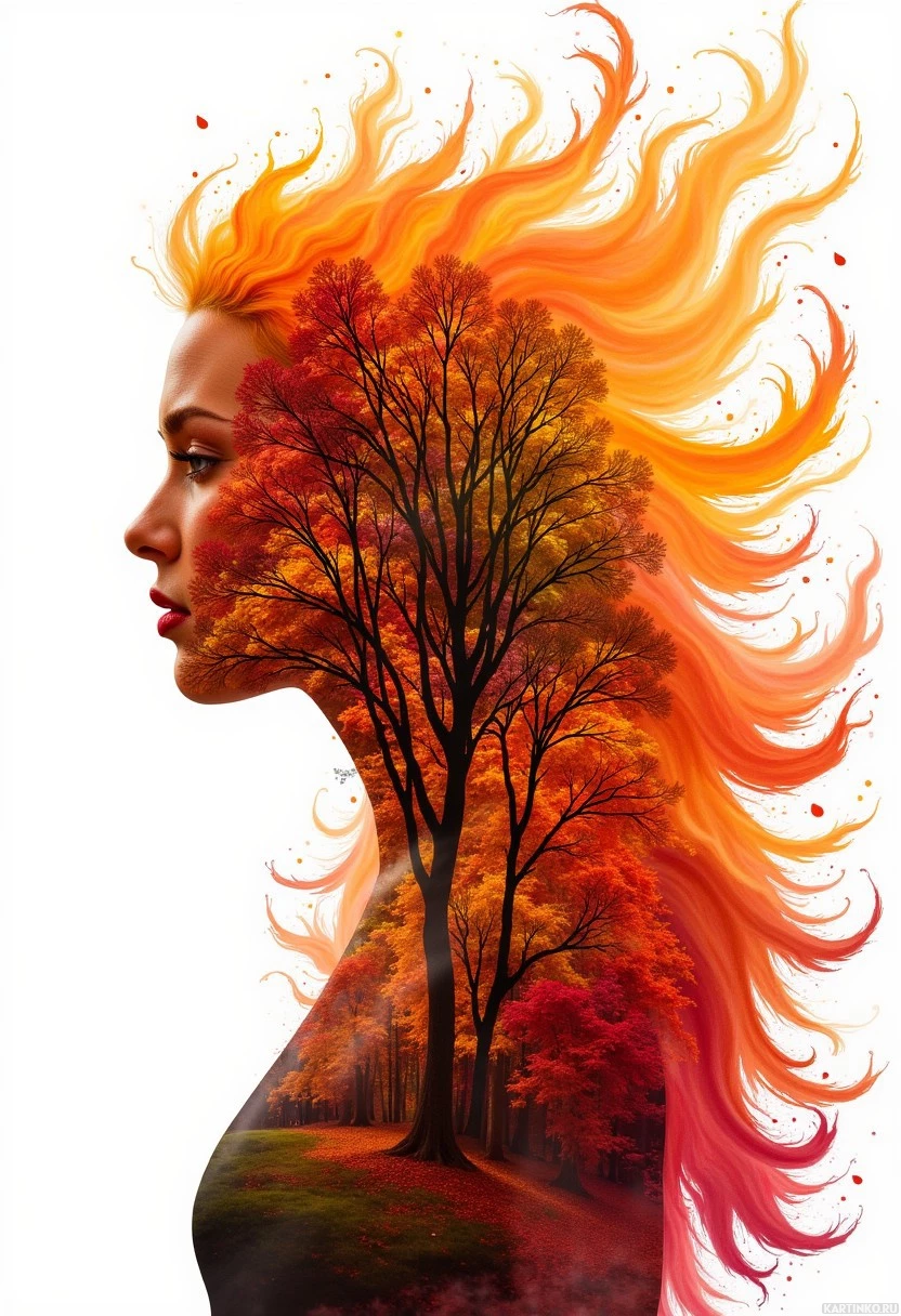 autumn leaves, suggesting the season may be fall. Surrounding this central figure are flames in various
