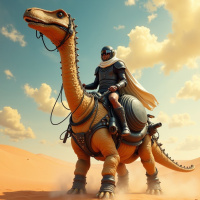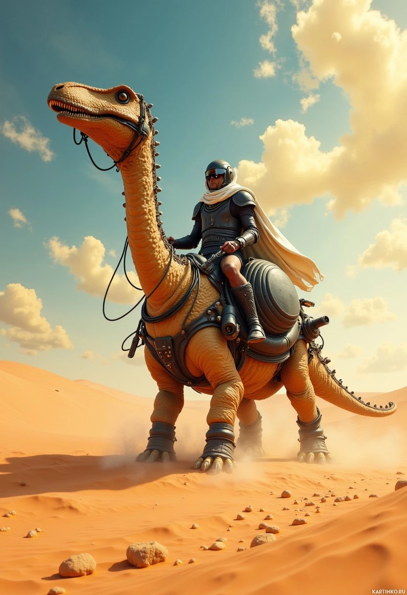 На картинке изображена фантастическая сцена: мужчина едет на динозавре. На нем доспехи и шлем, он словно держит поводья динозавра, у которого на спине отчетливо видны шиповатые пластины. За ними простирается пустынный пейзаж, над головой – ярко-голубое небо.